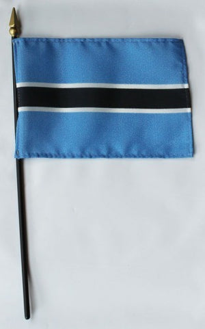 Our 4in x 6in Botswana miniature Stick Flags are made of an extremely durable silk-like material and are mounted on a 10.5inch black plastic staff with a gilt spearhead. Each flag is individually sewn around the edges. These are perfect for decorating or for waving in a parade to show your national pride.