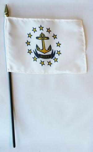 Our 4in x 6in Rhode Island miniature Stick Flags are made of an extremely durable material and are mounted on a 10.5inch black plastic staff with a gilt spearhead. These are perfect for decorating or for waving in a parade to show your state pride.