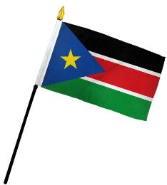 Our 4in x 6in South Sudan miniature Stick Flags are made of an extremely durable material and are mounted on a 10.5inch black plastic staff with a gilt spearhead. Each flag is individually sewn around the edges. These are perfect for decorating or for waving in a parade to show your national pride.
