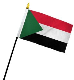 Our 4in x 6in Sudan miniature Stick Flags are made of an extremely durable material and are mounted on a 10.5inch black plastic staff with a gilt spearhead. Each flag is individually sewn around the edges. These are perfect for decorating or for waving in a parade to show your national pride.