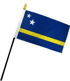 Nuestras banderas en miniatura de Curazao de 4 x 6 pulgadas están hechas de un material similar a la seda extremadamente duradero y están montadas en un asta de plástico negro de 10,5 pulgadas con una punta de lanza dorada. Cada bandera está cosida individualmente alrededor de los bordes. Son perfectos para decorar o para saludar en un desfile y mostrar su orgullo nacional.